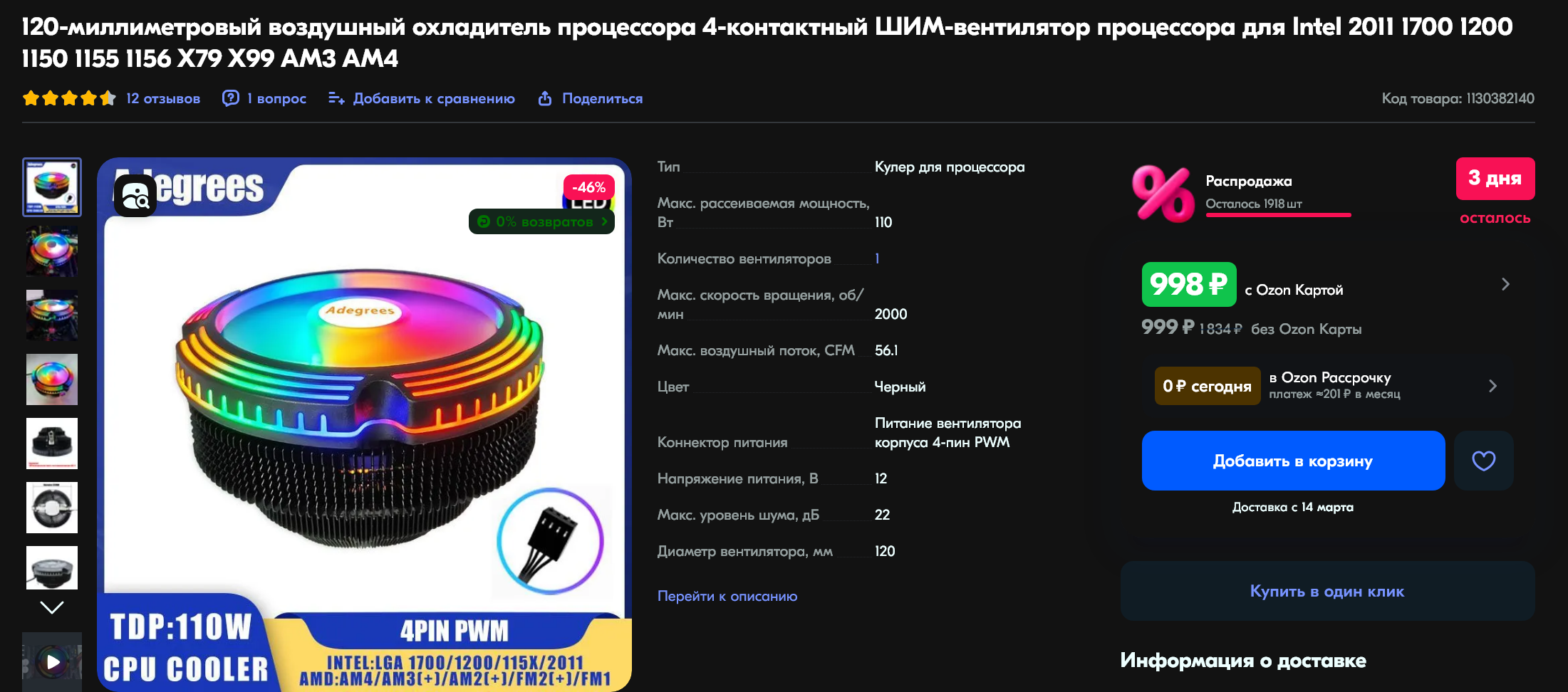 Кулер возьмем от бренда Adegrees, так как он самый дешевый и при этом обладает всеми нужными характеристиками: RGB-подсветка, крепление для сокета LGA2011, отвод 110 Вт тепла. Это модель с вентилятором 120 мм. Кулер имеет коннектор 4-pin, а это значит, что материнская плата сможет регулировать обороты кулера в зависимости от нагрузки. Также важно отметить, что вентилятор дует на материнскую плату, а значит будет обдувать зону питания процессора в верхней части материнской платы. Там производитель уже приклеил радиаторы, которые только и ждут, когда их будут обдувать. Но что еще не маловажно, данный кулер будет обдувать наш nvme накопитель, который располагается сразу под гнездом процессора. Таким образом твердотельный накопитель всегда будет оставаться холодным и не будет сбрасывать скорость передачи данных из-за перегрева. Цена этого кулера всего 998 рублей. Артикул на ОЗОНе - 1130382140.