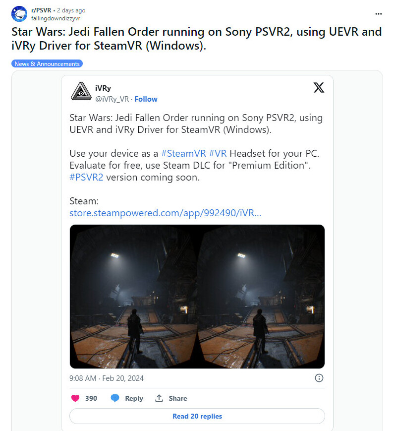Проект "iVRy VR" разрабатывает соответствующий драйвер и в конце прошлого года сообщил о возможности использования PS VR2 для SteamVR на ПК. Последние сообщения iVRy в социальных сетях подтверждают, что многие игры, включая Star Wars: Jedi Fallen Order, уже работают с использованием PS VR2. Есть слухи о том, что Sony может заняться разработкой поддержки для ПК уже в 2024 году.