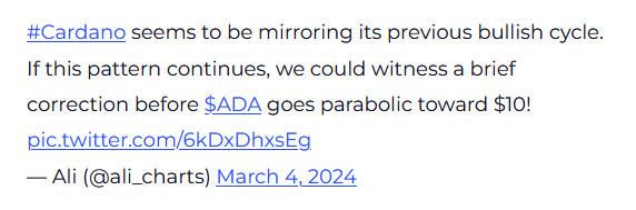 Криптовалюта Cardano (ADA) продолжает расти и может достигнуть отметки в $10, что приведет к повышению на 2 084%. Аналитик Али отмечает, что Cardano повторяет свой предыдущий бычий цикл, и если эта модель продолжится, то цена может сначала испытать короткую коррекцию, а затем параболически вырасти до $10.