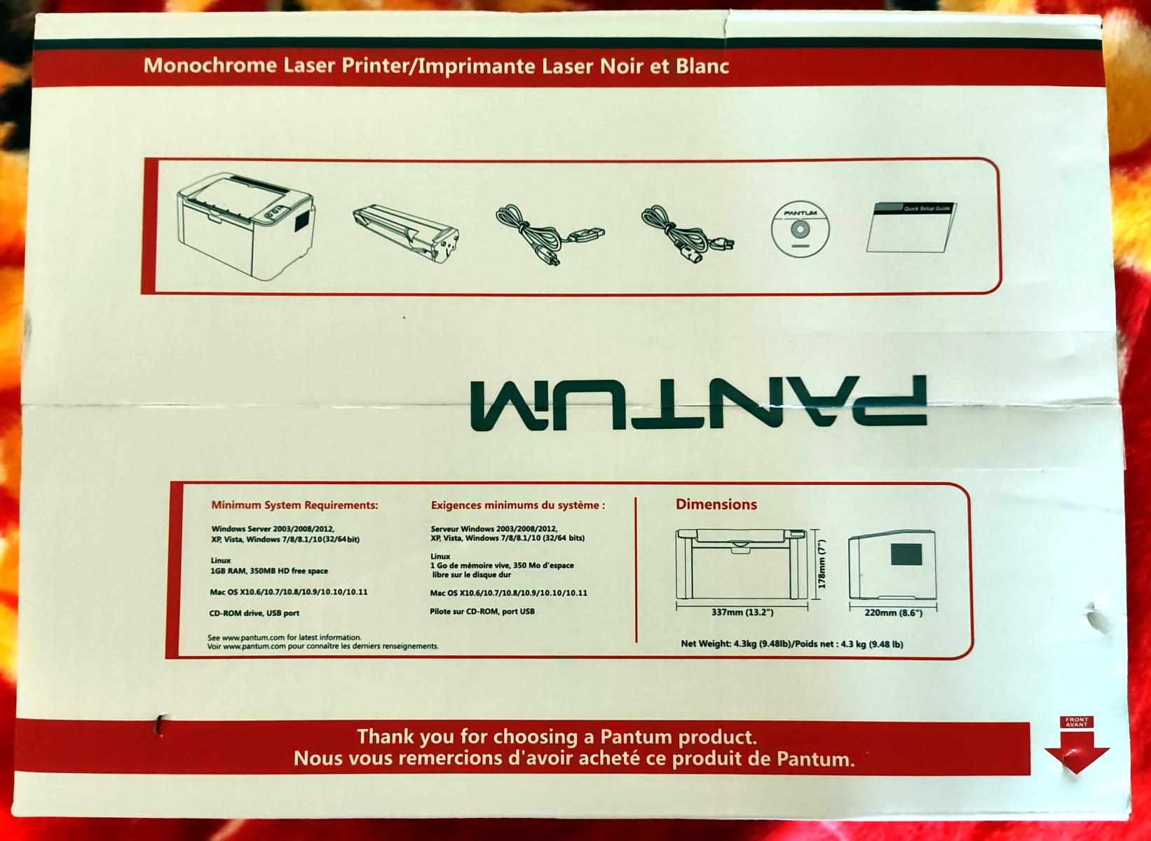 На верхней части коробки нарисовано что внутри. Коробка заклеена фирменным скотчем pantum. Также на коробке видно, что для этого принтера есть драйвера для всех операционных систем, даже для XP. Другим именитым производителям взять бы пример с Pantum. Например, Canon для старых принтеров не выпускает драйверы для новых систем вообще.