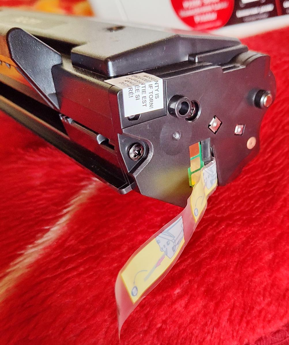 Далее я достал сам картридж и вытянул из него за ярлык жёлтую пластиковую ленту, которая предохраняет от просыпания тонера в процессе транспортировки. Если бы не эта лента, то немного тонера могло бы высыпаться, пока принтер был в пути от завода ко мне, через множество складов и рук грузчиков.