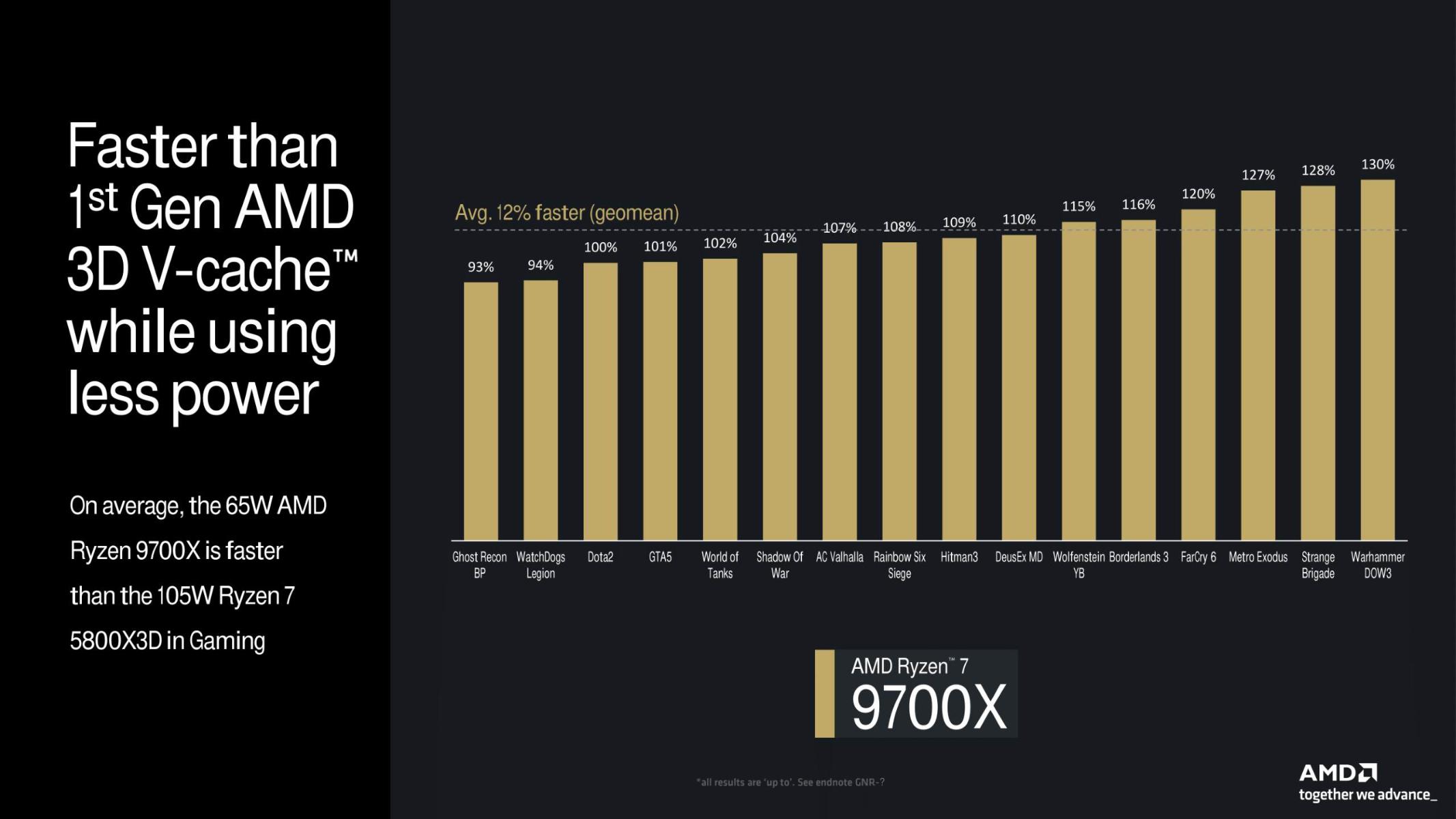 Компания AMD также указала, что Ryzen 7 9700X должен быть в среднем на 2% быстрее, чем Ryzen 7 7800X3D по сравнению с теми же тестами, которые использовались при сравнении с Ryzen 7 5800X3D. В ходе демонстрации игровой производительности выбрали несколько игр, в результате чего общие показатели могут различаться. В некоторых играх, где применяется технология 3D V-Cache, Ryzen 7 7800X3D все еще является более производительным, но в других играх Ryzen 7 9700X также проявляет высокую производительность.