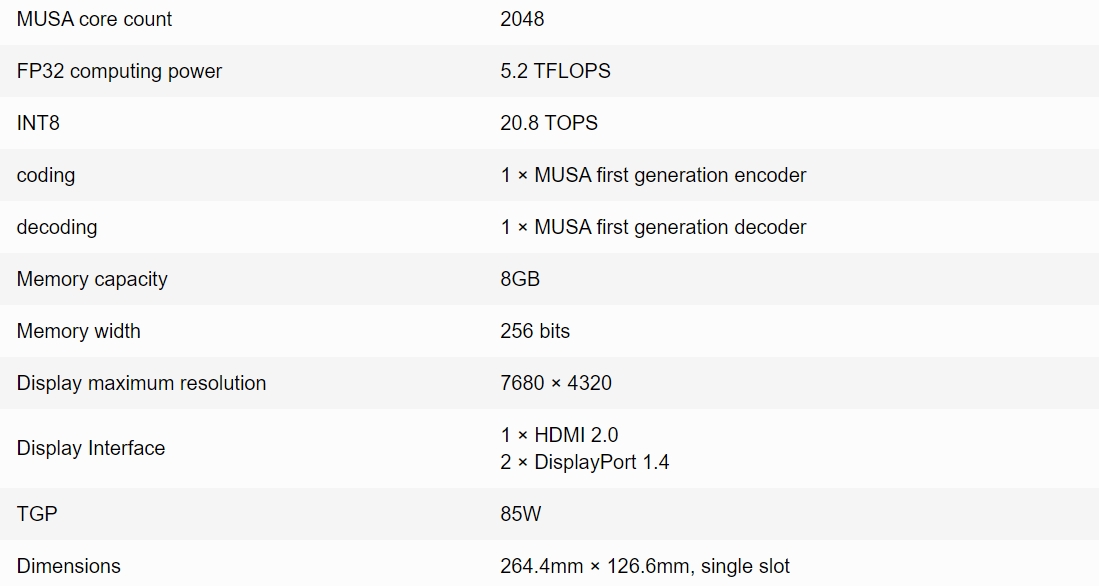 Теперь компания предлагает новый графический процессор MTT S50, который имеет архитектуру MUSA и оснащен 2 048 ядрами. GPU также обладает 8 ГБ памяти GDDR6 и вычислительной мощностью FP32 до 5,2 TFLOPS. Одна из главных особенностей MTT S50 - это его низкое энергопотребление в 85 Вт, что делает его энергоэффективным вариантом.