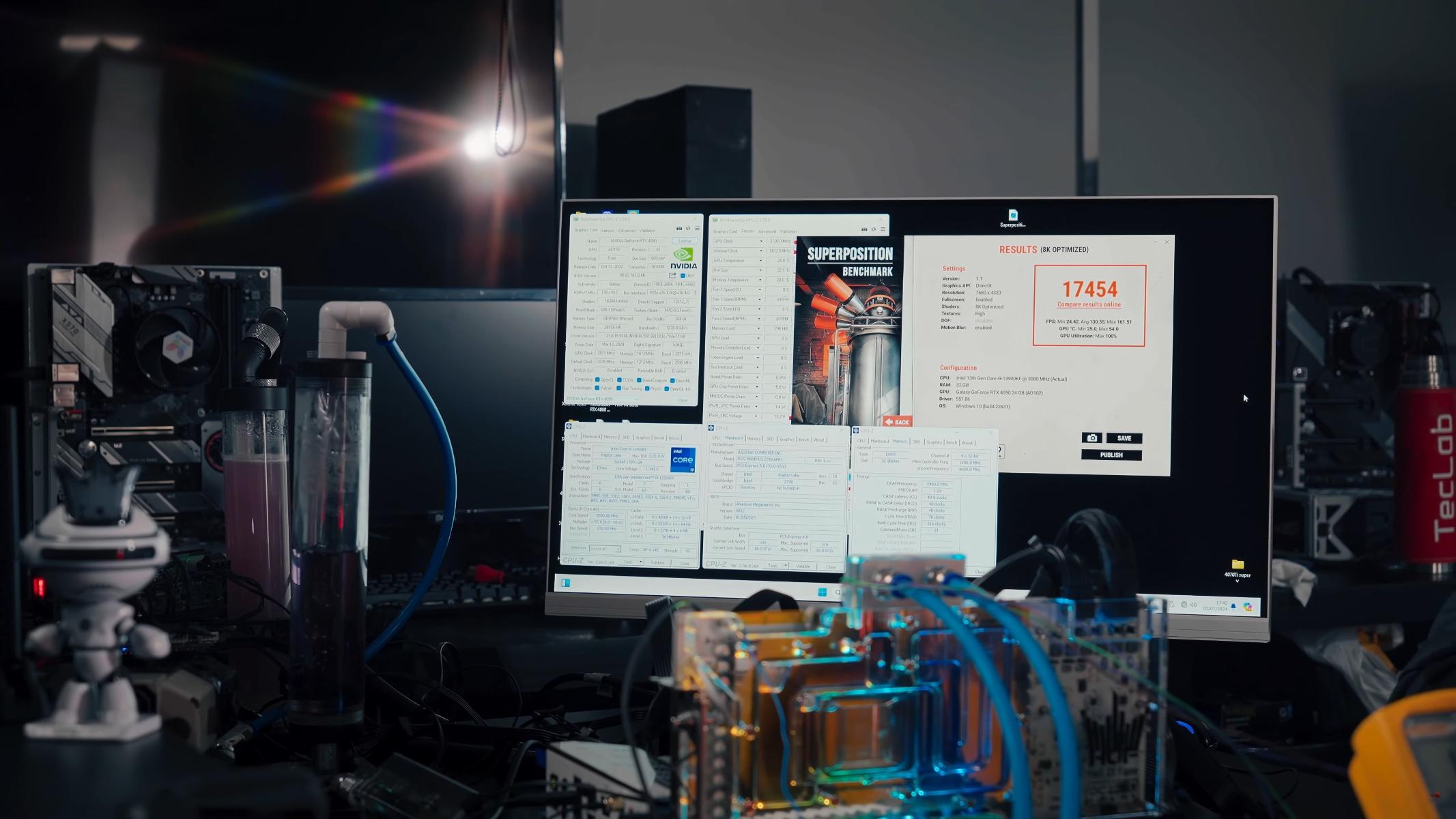 В тесте бенчмарка Unigine Superposition 8K Teclab достигла разгонной частоты GPU до 3105 МГц и частоты памяти 12 900 МГц, что привело к скорости памяти 25,8 Гбит/с. В результате пользовательская NVIDIA GeForce RTX 4090 SUPER от Tecblab превзошла показатели LN2 RTX 4090 при использовании только водяного охлаждения. В сравнении со стоковым графическим процессором NVIDIA GeForce RTX 4090, Teclab достигла 39% улучшения с разгоном и 16,5% улучшения без LOD-твиков.