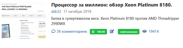 Процессор за миллион: обзор Xeon Platinum 8180 от 17 октября 2018. За все время она смогла набрать лишь 19414 просмотров.