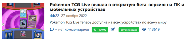 Самый популярный материал всех времен в моем блоге – это новость «Pokémon TCG Live вышла в открытую бета-версию на ПК и мобильных устройствах» за 27 ноября 2022. Она собрала 113619 просмотров. Из этого можно предположить, что покемоны очень популярны в России.