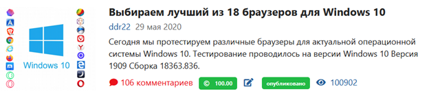 На третьем месте по числу просмотров разместилась статья о выборе браузера – «Выбираем лучший из 18 браузеров для Windows 10». Она набрала 100902 просмотра. Вероятно, сотни тысяч человек в 2020 году волновала проблема выбора лучшего браузера.