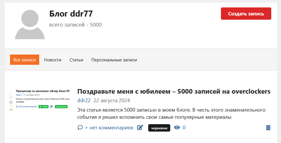 Уверен, что среди читателей этого сайта нет никого, кто бы не читал ни одного моего материала. Вот уже 6 лет этот блог (https://overclockers.ru/blog/ddr77?offset=20&max=9920) продолжает почти в ежедневном режиме (бывают дни, когда я ничего не пишу в блог – все-таки надо иногда отдыхать) радовать читателей сайта overclockers. Эта статья является 5000 записью в моем блоге. В честь этого знаменательного события я решил вспомнить свои самые популярные материалы.