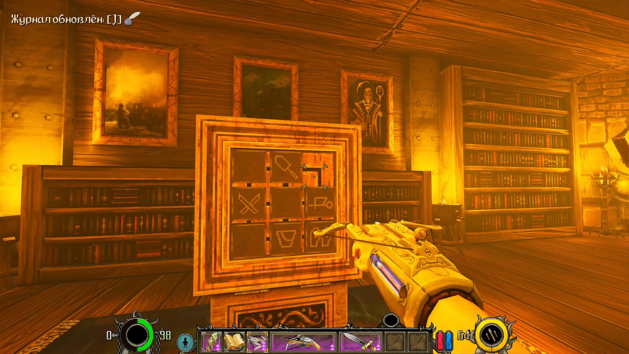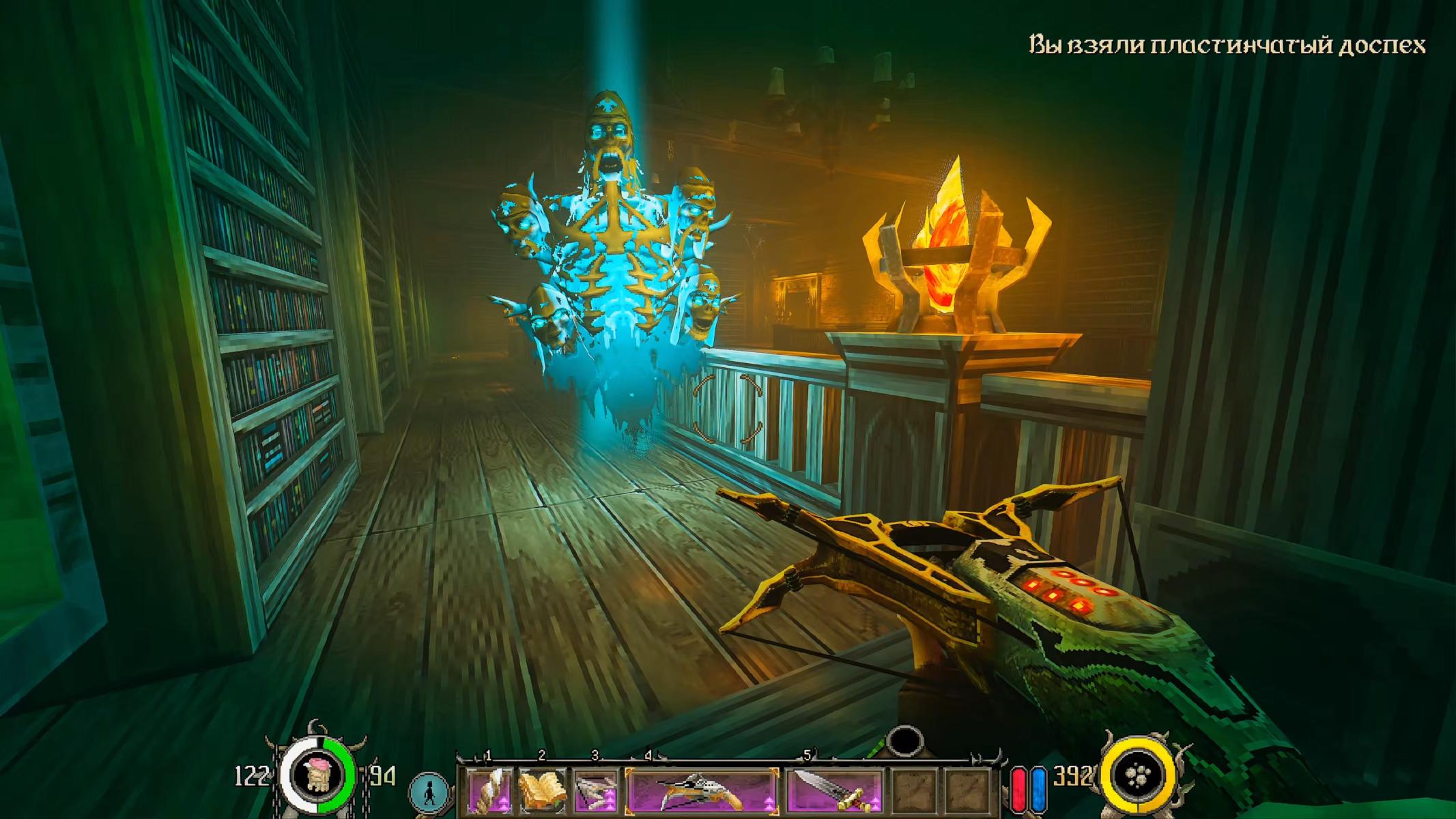 После вставляем найденные шестеренки в лифт и поднимаемся на нем в библиотеку. В библиотеке вас будет преследовать светящееся голубым светом привидение без моторчика. Обратите внимание – у него 5 голов. Чтобы его убить надо отстрелить все головы. После его смерти выпадает жуткое перо, которое нужно будет обменять на апгрейд оружия в лавке Ступка Мельхиора.