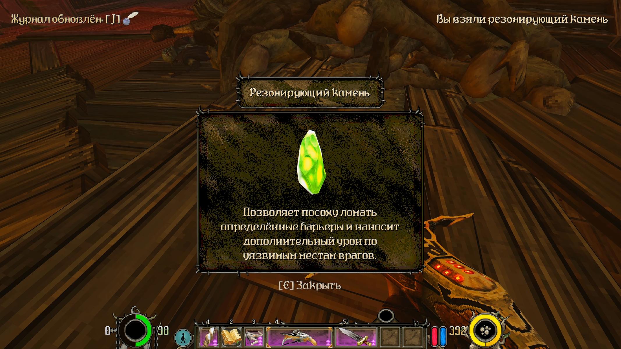 Этот ключ открывает решетку, за которой деревянная лестница наверх. Поднимаемся, смотрим катсцену как мы падаем вниз. Не забываем подобрать резонирующий камень для посоха. Вставляем его в посох. Теперь мы можем ломать стены и двери, покрытые трещинами.