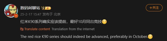 Согласно утечке информации, преемник серии Redmi K80, известной субфлагманской линейкой смартфонов китайской компании Xiaomi, может быть представлен раньше, чем ожидалось. По информации инсайдера Digital Chat Station, серия K90 может выйти уже в октябре, что на месяц раньше предполагаемого срока. На данный момент компания не раскрыла официальной информации об этом. Ожидается, что серия K90 будет состоять как минимум из двух моделей - K90 и K90 Pro.