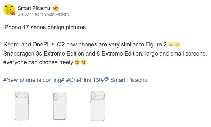 Утечка также раскрывает некоторые детали о дизайне OnePlus 13T. Утверждается, что он будет вдохновлен дизайном iPhone 16 и предстоящего iPhone 17. Предыдущие утечки уже говорили о наличии у телефона двойной задней камеры, и это подтверждается новыми сведениями. Фото утекшего дизайна показывают сходство OnePlus 13T с моделью Redmi Turbo 4 Pro, который также имеет внешний вид, похожий на iPhone 16.
