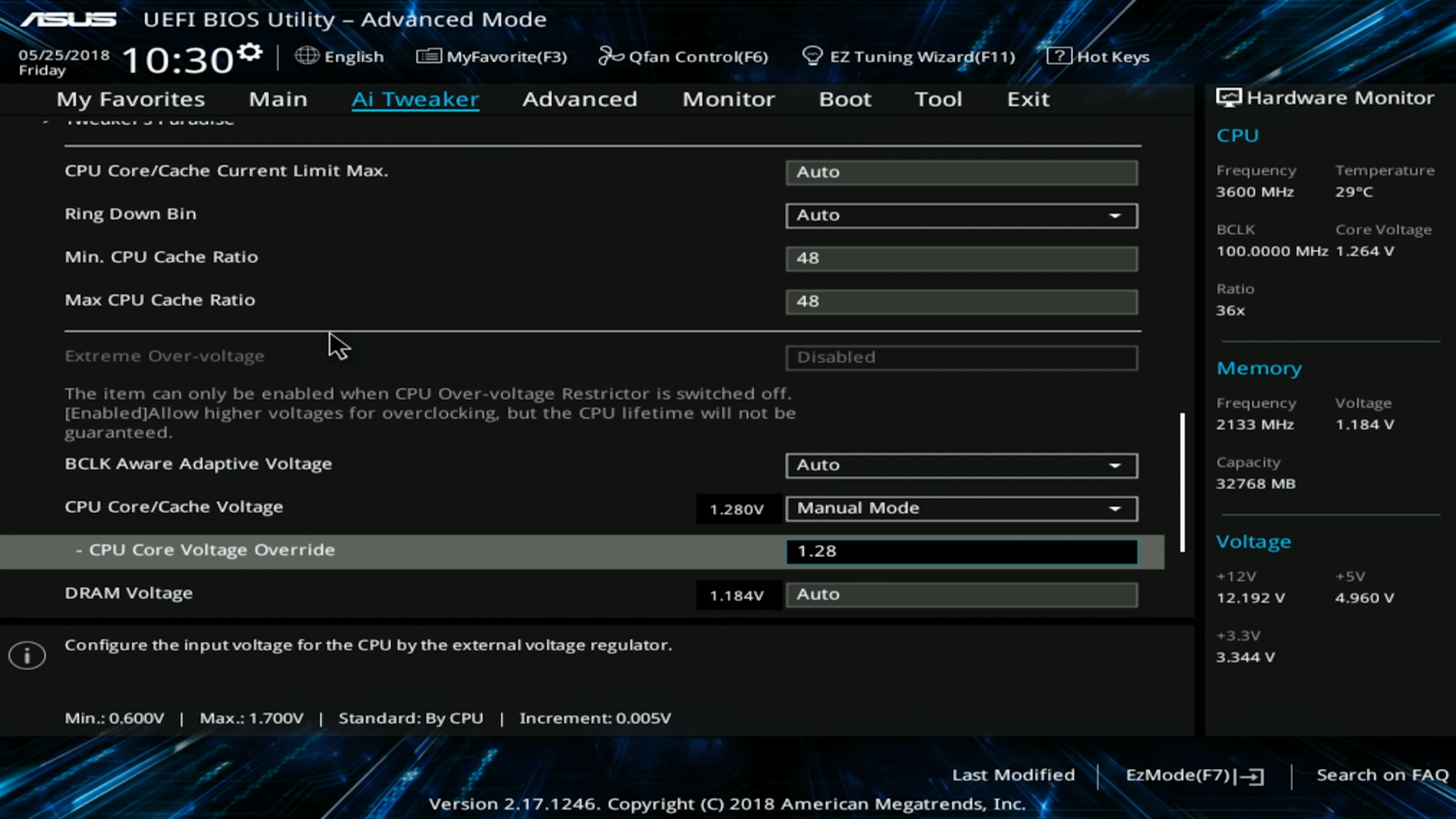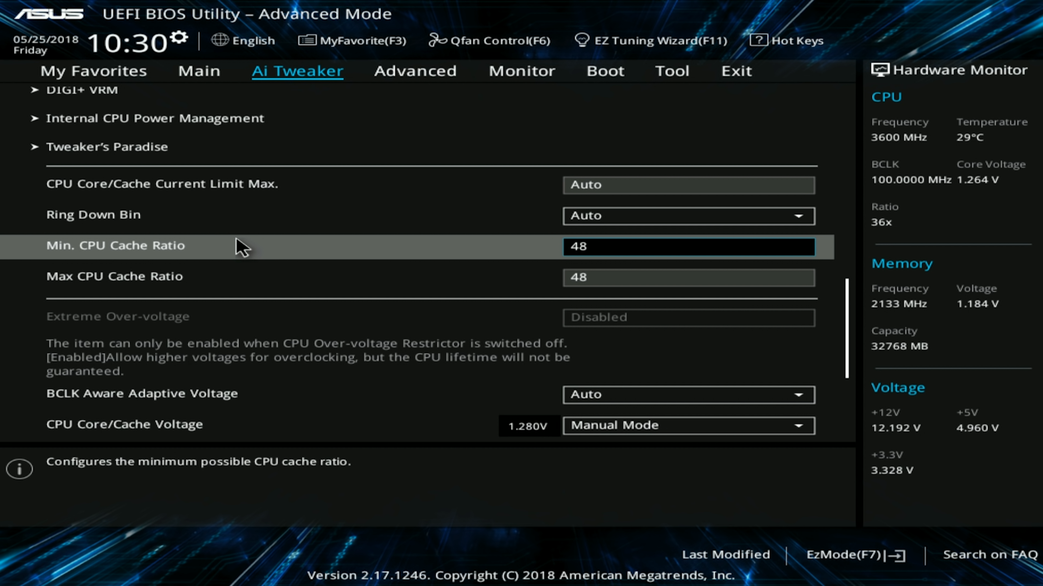 Идем дальше – устанавливаем множитель кэша процессора на 48, а напряжение процессора на 1.28V