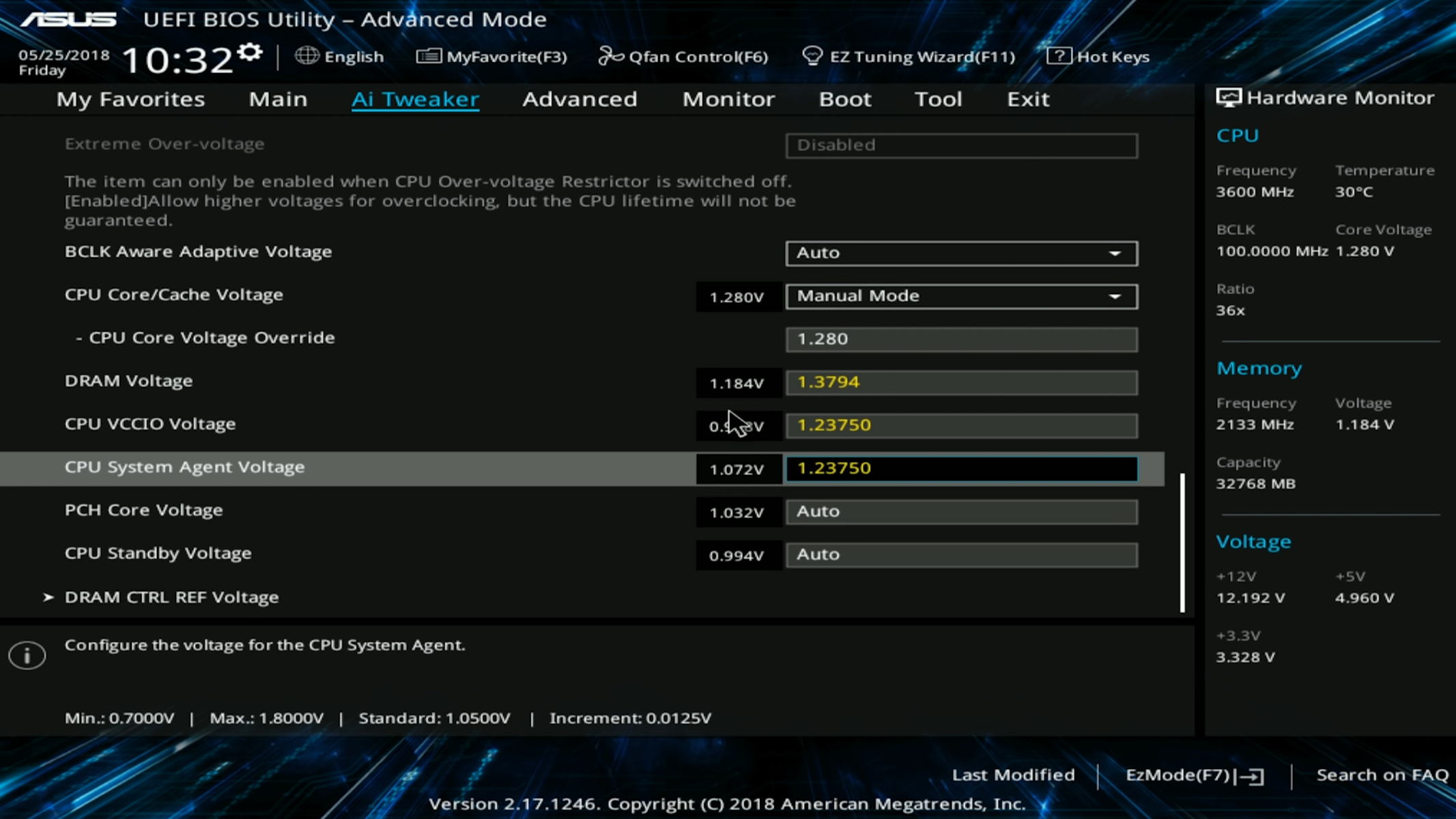 DRAM Voltage – 1.3794, CPU VCCIO Voltage – 1.2375, CPU System Agent Voltage – 1.2375