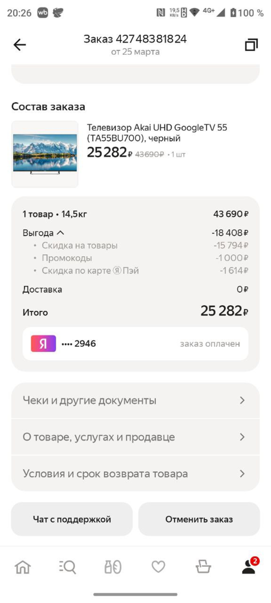 Главным требованием была центральная ножка — из-за узкой тумбы боковые опоры не подходили. Вариантов оказалось немного, но Akai соответствовал всем критериям, а цена на Яндекс Маркете в 25 990 рублей (против среднерыночных 35–38 тыс.) окончательно убедила в выборе. Сейчас телевизор стоит чуть дороже.