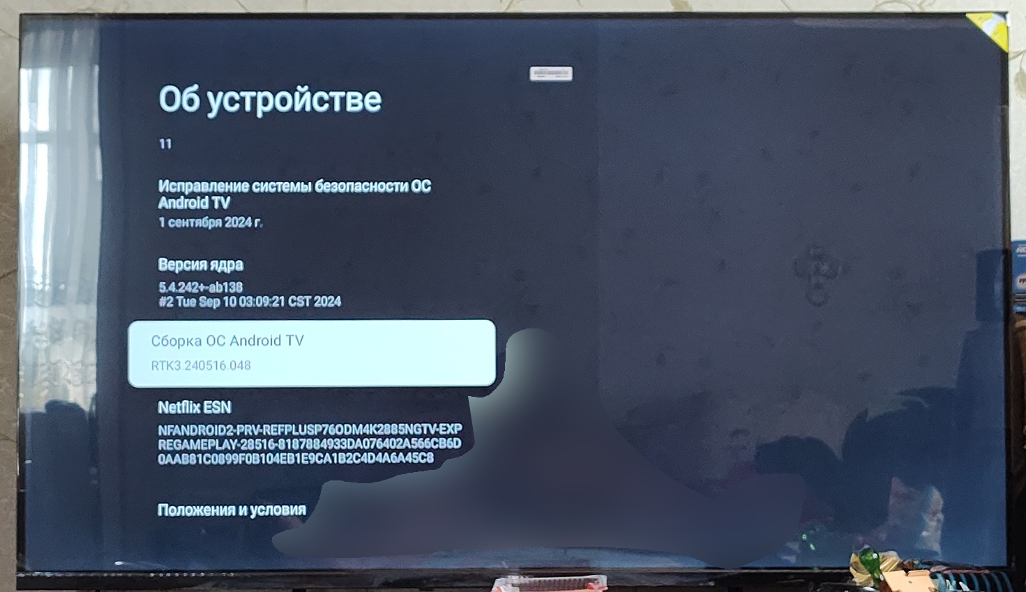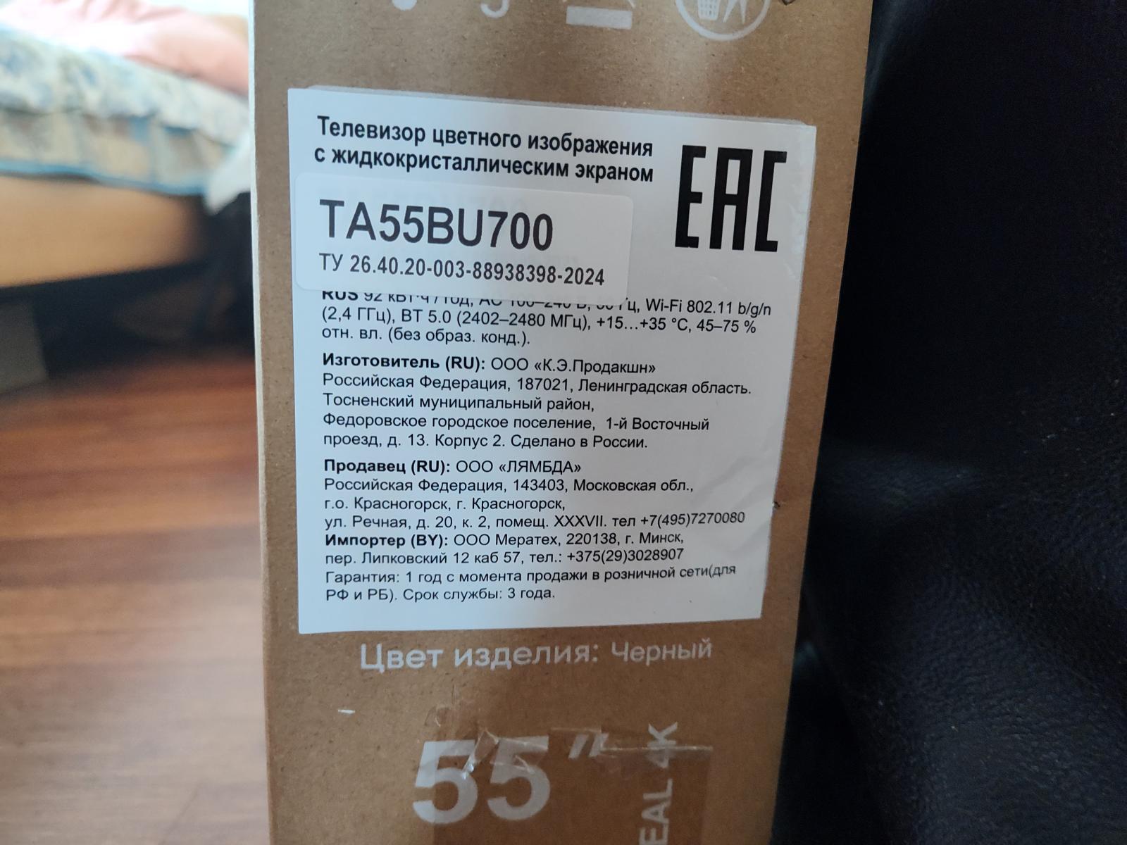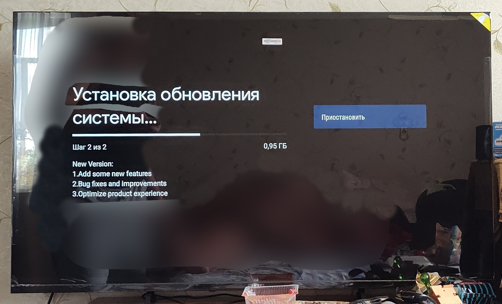 Телевизор приехал в целой коробке, обтянутой плёнкой. Внутри — сам аппарат, пульт с подсветкой кнопок (удобно ночью), центральная ножка и даже ветрозащита для микрофона (есть встроенное караоке-приложение). После включения сразу началось обновление системы — хороший знак, что поддержка есть.