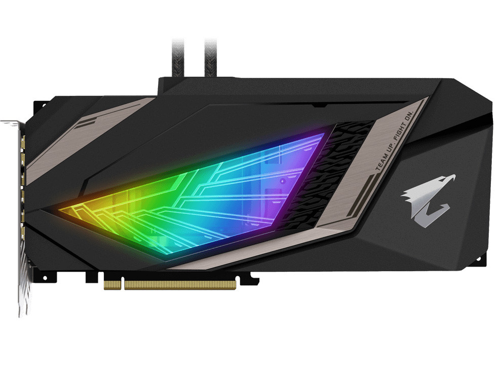 Компания Gigabyte выпустила новую видеокарту с полным водяным охлаждением AORUS GeForce RTX 2080 Ti XTREME WATERFORCE 11G. Карта покрыта слегка выпуклым водоблоком, имеющим подсветку с двух сторон. Водоблок изготовлен компанией Asetek. Ядро имеет заводской разгон с 1545МГц до 1770МГц. Память разогнана до 14140МГц, вместо стандартных 14000МГц. Размеры карты 290х131х 40 мм. За охлаждение отвечает 240-мм радиатор с 2x 120-миллиметровыми вентиляторами с RGB подсветкой. На карте имеется 7 видеовыходов, но воспользоваться сразу всеми нельзя. Можно только по двум схемам: либо 3xHDMI + 1xDP + 1xUSB-C, либо 3xDP + 1xHDMI + 1xUSB-C.