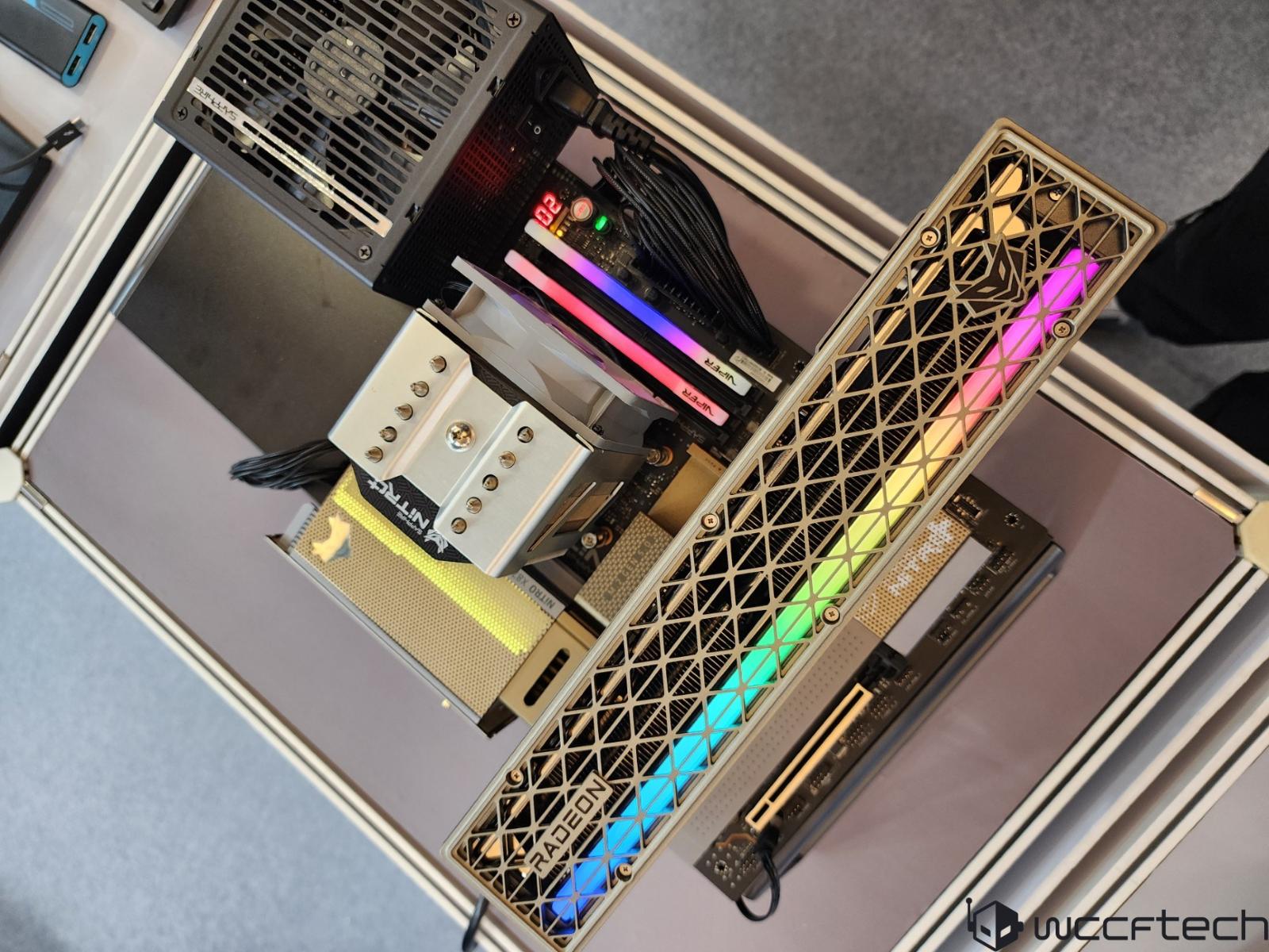 Одним из главных хитов стенда стал PhantomLink Radeon RX 9070 XT Nitro+ с внушительным энергопотреблением в 600 Вт. Это трёхвентиляторная видеокарта с золотистым кулером и тактовой частотой до 3060 МГц. Интересной деталью стало то, что 16-пиновый разъём спрятан под задней крышкой с магнитной фиксацией — внешний вид получился аккуратным, без торчащих проводов.