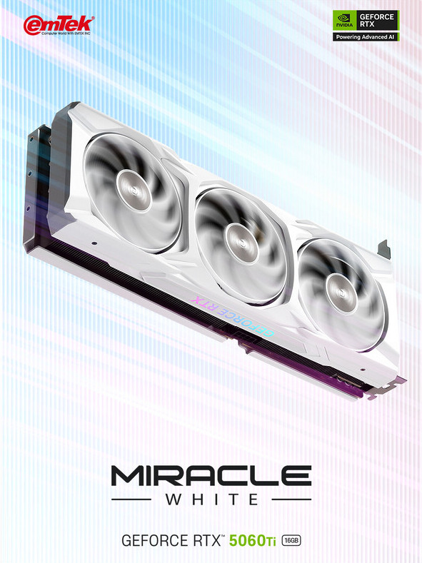 EMTEK расширила линейку MIRACLE WHITE, добавив видеокарты GeForce RTX 5060 Ti с 8 и 16 ГБ памяти