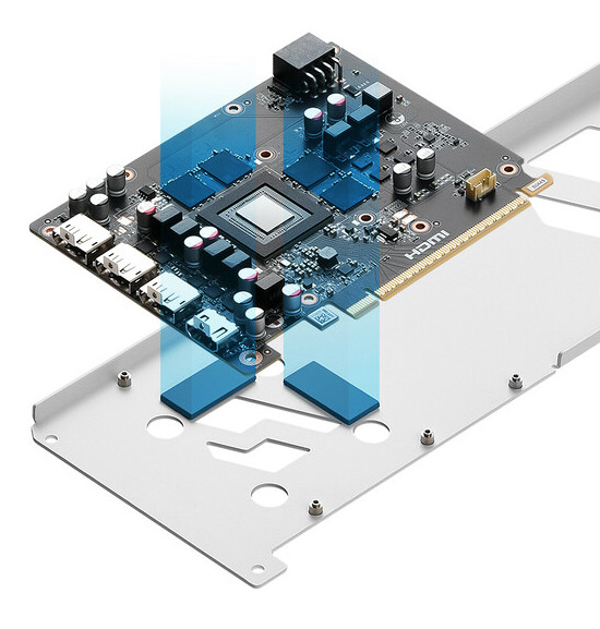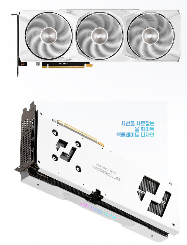 Визуально карты продолжают стиль предыдущих моделей: белый корпус, три вентилятора и массивный радиатор, при этом без поддержки RGB-освещения. Интересно, что используется не полностью белая плата — внутренности остаются традиционного чёрного цвета. Система охлаждения стала немного тоньше (2 слота вместо 2.5).
