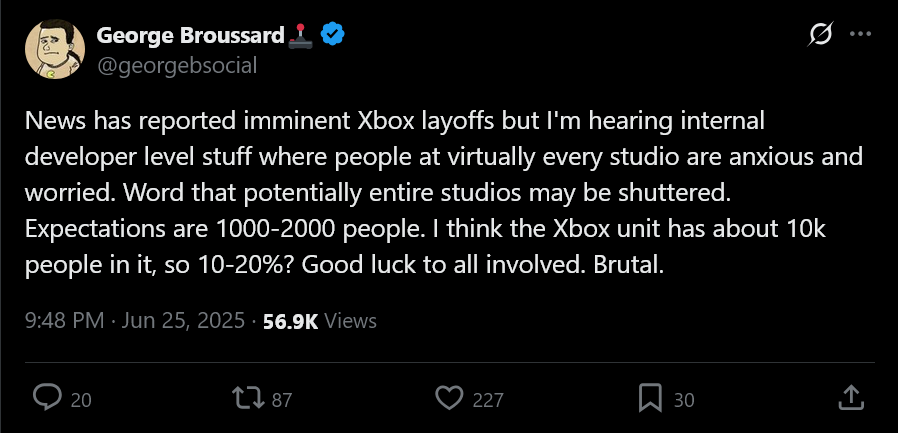 По информации от инсайдеров, включая создателя серии Duke Nukem Джорджа Броссара, Microsoft может провести масштабные сокращения в своём игровом подразделении Xbox Gaming. Ожидается, что к концу июня будет затронуто около 2000 рабочих мест. Это может повлиять как на отдельных сотрудников, так и на целые студии, включая разработчиков из Turn 10 Studios, ответственных за серию Forza.