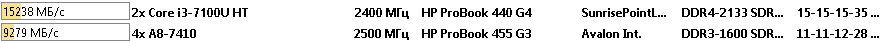 Теперь процессор AMD A8-7410 потерпел разгромное поражение, процессор Intel Core i3-7100U оказался быстрее больше чем в 2 раза.
