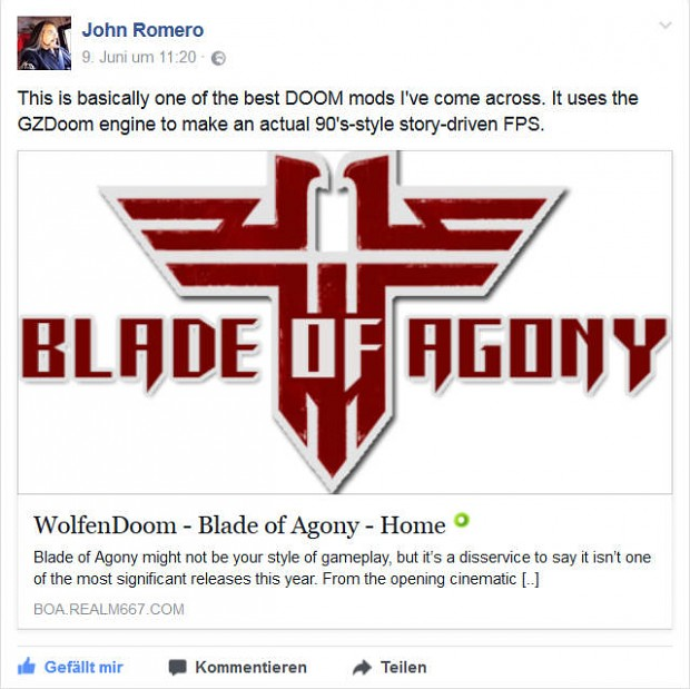 Игра 2016 года - WolfenDoom Blade of Agony. Это сюжетный шутер от первого лица. Проект черпал вдохновение в шутерах по Второй мировой войне 90-х и начала 2000-х, таких как Wolfenstein 3D, Medal of Honor и Call of Duty, но обладает более динамичным игровым процессом в духе Doom! В игру можно играть отдельно, используя движок GZDoom в качестве основы. Версия 2.0 вышла 9 марта 2020 года.