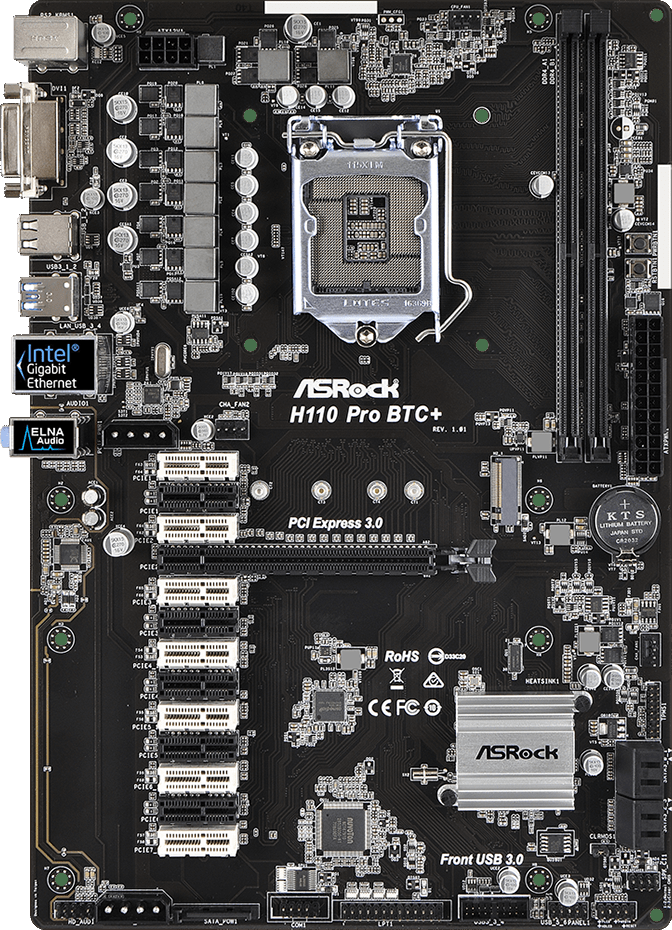 Далее материнская плата ASRock H110 Pro BTC+. Как можно догадаться, это материнская плата для майнеров. И необычно в ней то, что она имеет один слот PCI-E x16 и двенадцать слотов PCI-E x1, то есть на плату можно установить 13 видеокарт.