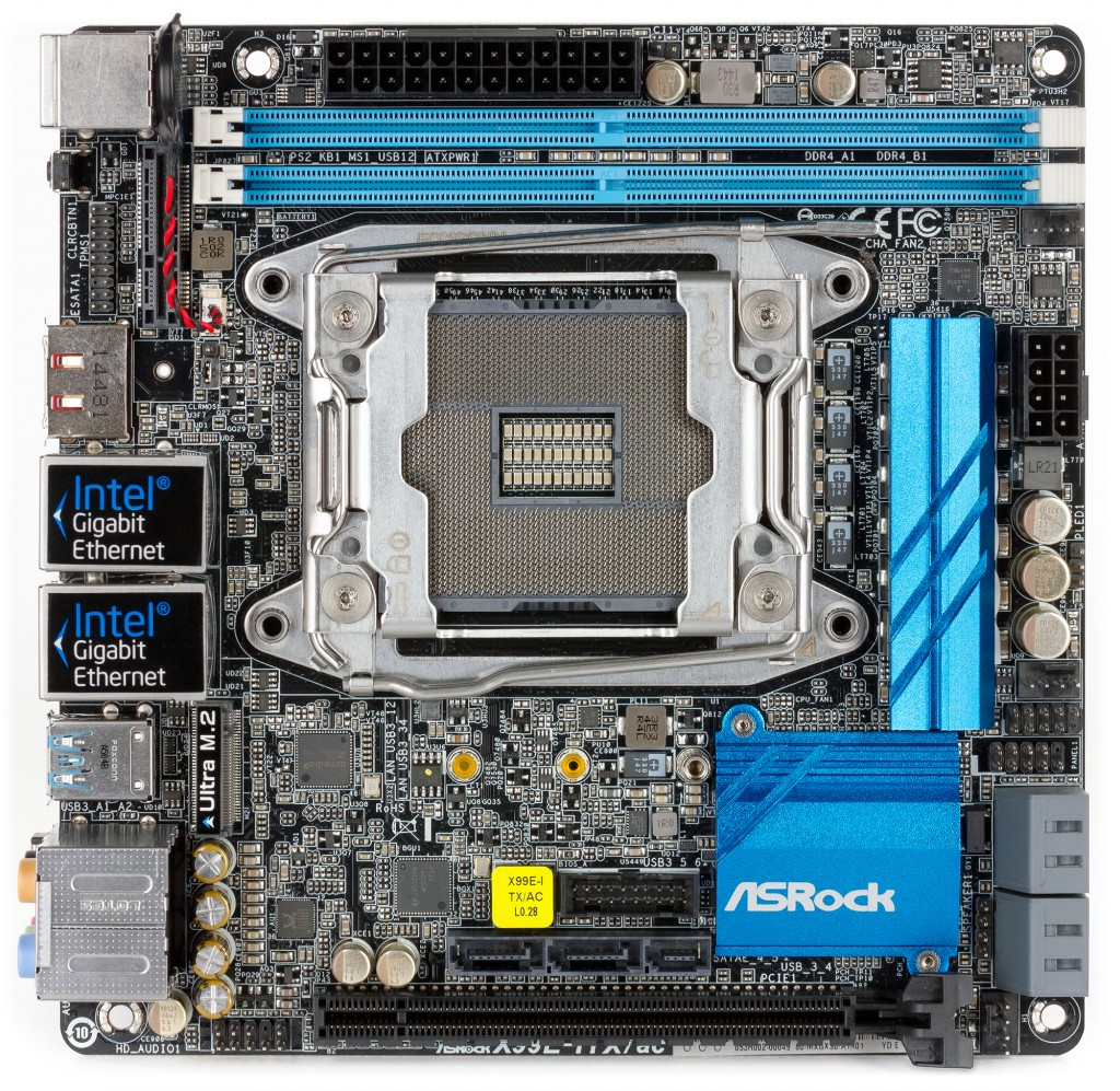 Далее материнская плата ASRock X99E-ITX/ac. Это плата формата miniITX с чипсетом x99 и с сокетом 2011-3. Необычность этой платы в размере, а так же в том, что процессоры для данного сокета работают в четырехканальном режиме, а на плате есть только два слота под оперативную память.