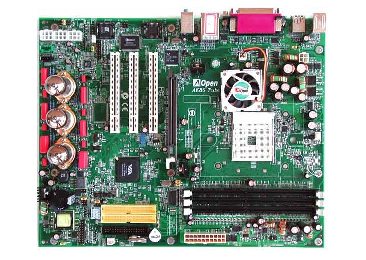 Следующая материнская плата AOpen AK86 tube 3. Необычного в ней то, на плате распаяно три лампы для лампового усилителя звука.