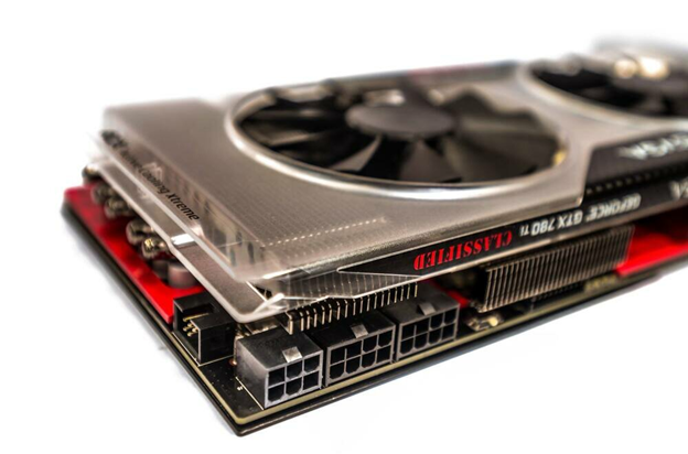 Карта имеет необычный полупрозрачный кожух, а также мощную подсистему питания. Для питания платы нужно подключить два разъема 8-пин и один 6-пин.