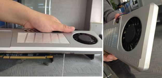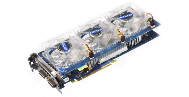 Видеокарта с двумя чипами GTS 250. Необычно было реализовано охлаждение. Вентиляторы размещались на отдельной плате, которую надо было установить в следующий слот материнской платы.