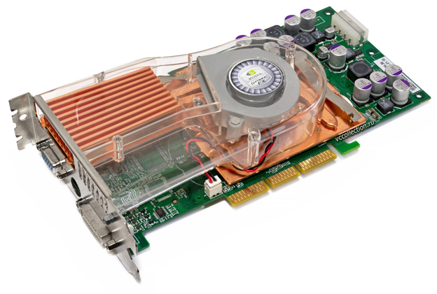 Это видеокарта в референсном исполнении от NVIDIA. В те времена компания сама не изготавливала видеокарты. Но в этом случае решила сделать все самостоятельно. Очень необычно выполнена система охлаждения. Видеокарта является очень редкой и высоко ценится у коллекционеров.