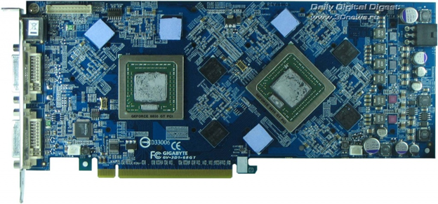 Самостоятельная попытка компании Gigabyte совместить на одной плате два видеочипа 6600GT. К сожалению, данная видеокарта работала только в одной материнской плате того же производителя.