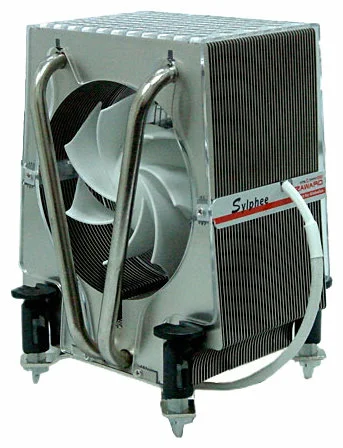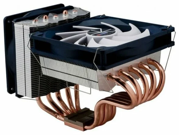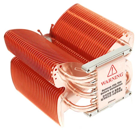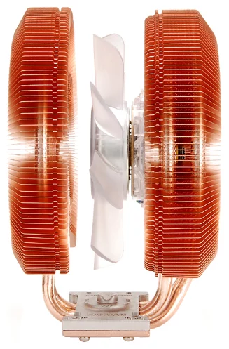 Данный процессорный кулер имеет необычную компоновку. Две секции радиатора, пронизанные пятью тепловыми трубками, противопоставлены друг другу под прямым углом.