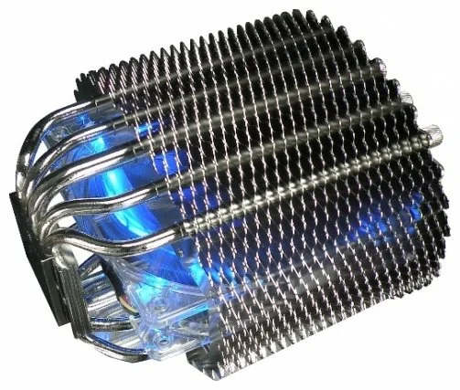 Данный процессорный кулер имеет очень необычный радиатор с пятью тепловыми трубками, собранный из овальных пластин с зазубренными краями. Внутри радиатора спрятан вентилятор 120 мм с голубой подсветкой, вращающийся со скоростью 2200 об/мин.
