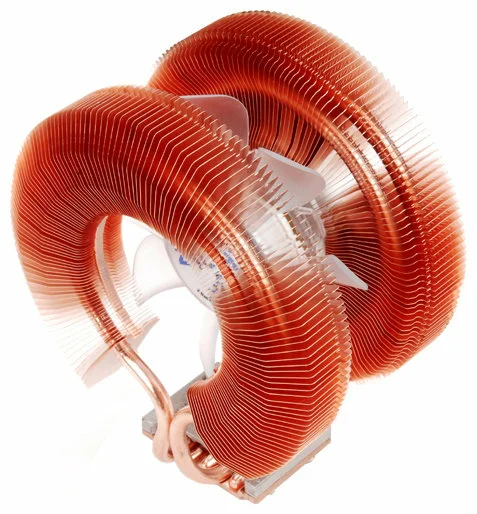 Еще один красивый процессорный кулер, выполненный из чистой меди. Двухсекционный радиатор выполнен в форме цветка.