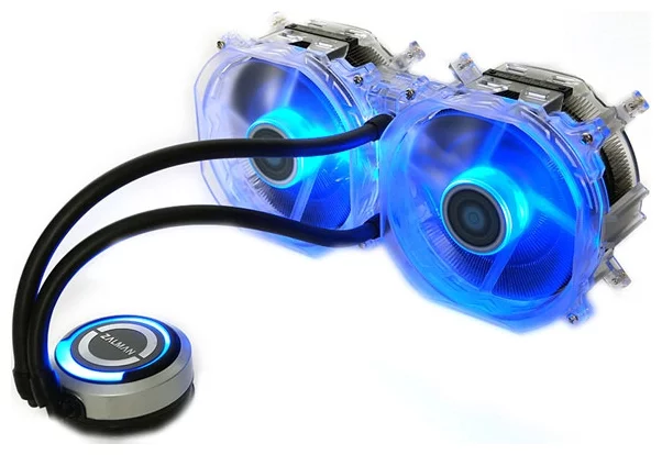Эта система жидкостного охлаждения имеет очень необычную форму радиатора. Обычно радиаторы имеют прямоугольную форму. Но в данном случае радиатор разделен на две круглые секции, каждая из которых продувается вентилятором 120 мм с синей подсветкой со скоростью вращения 2300 об/мин.