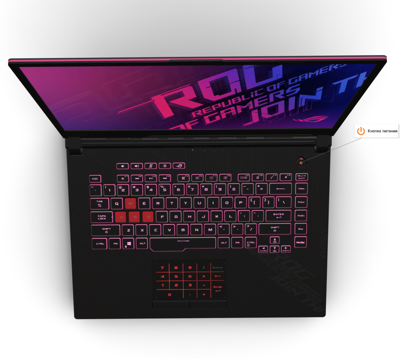 Клавиатура имеет RGB -подсветку, и не имеет цифровой блок клавиш. Вместо этого цифровые кнопки нанесены на тачпаде. Мне это также не важно, так как я пользуюсь отдельной механической клавиатурой. Нижняя крышка по периметру имеет светящуюся полосу.