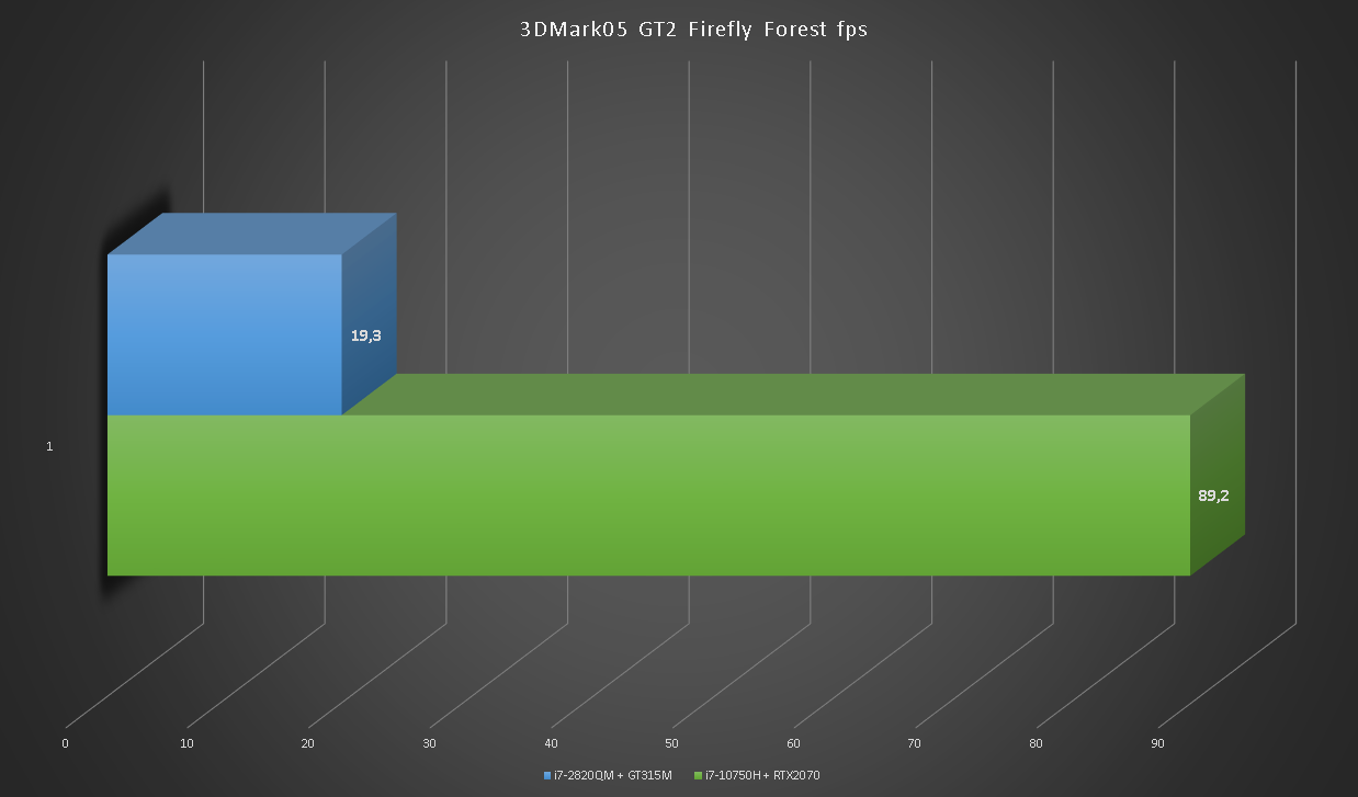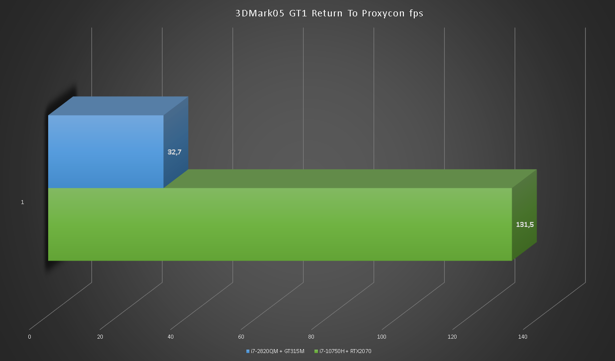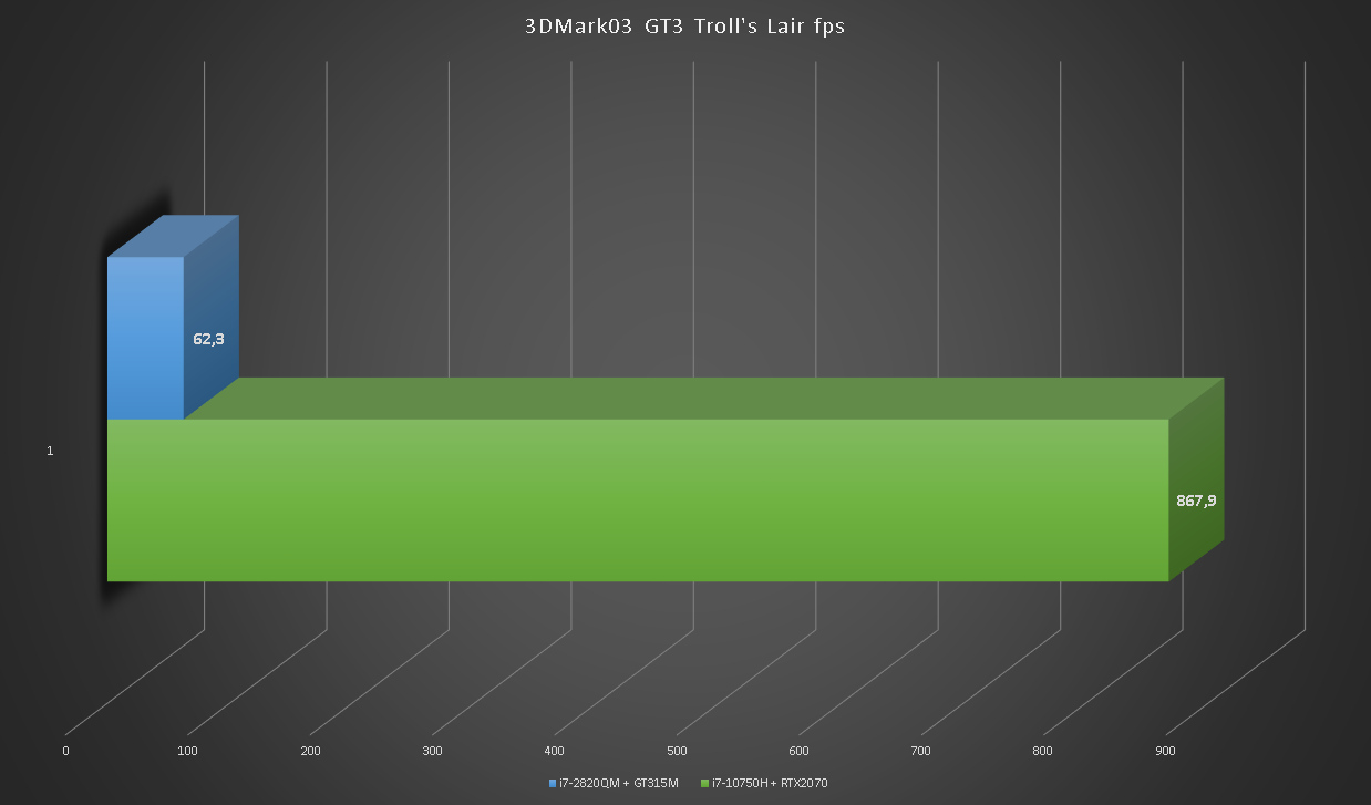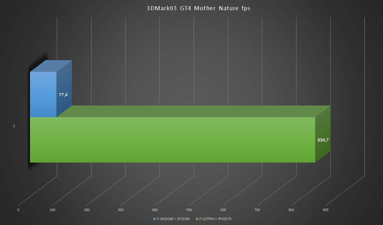 Глядя на такой одиннадцатикратный разрыв сложно поверить в то, что на GT315M можно играть. Больше тысячи кадров в секунду в игровых тестах RTX2070 впечатляют.