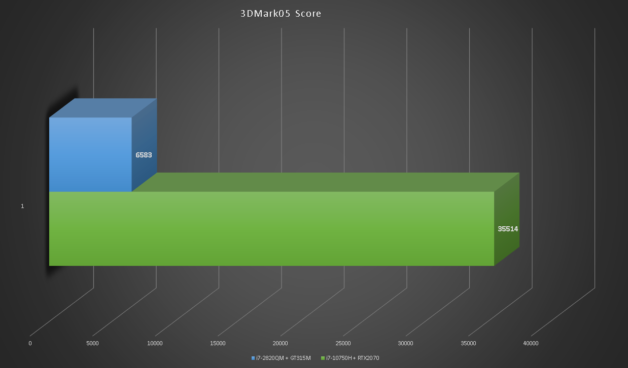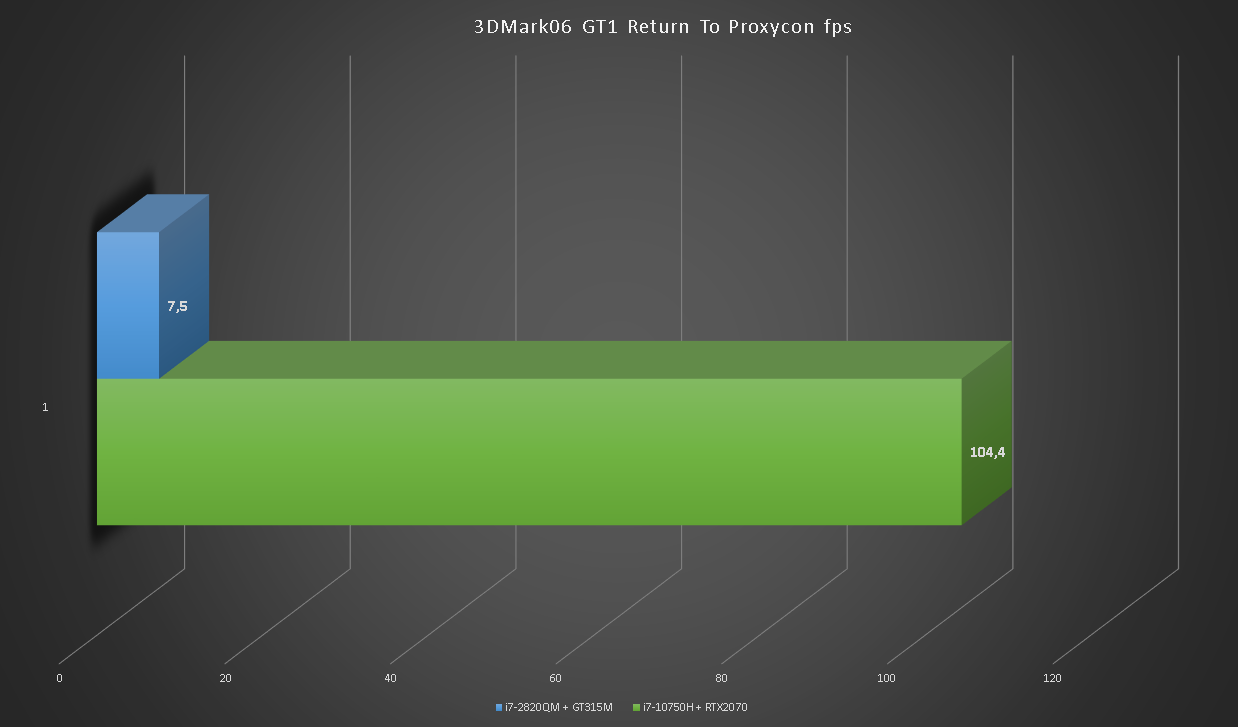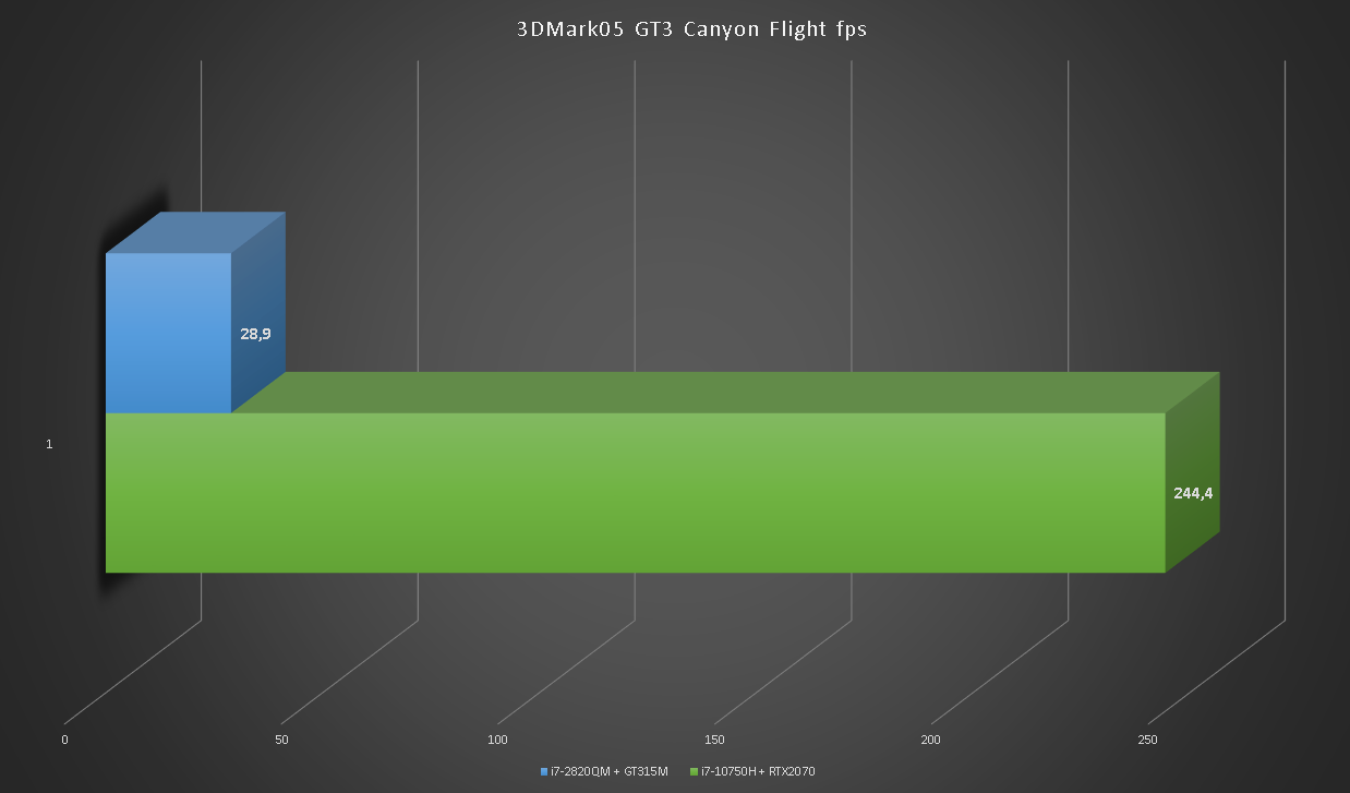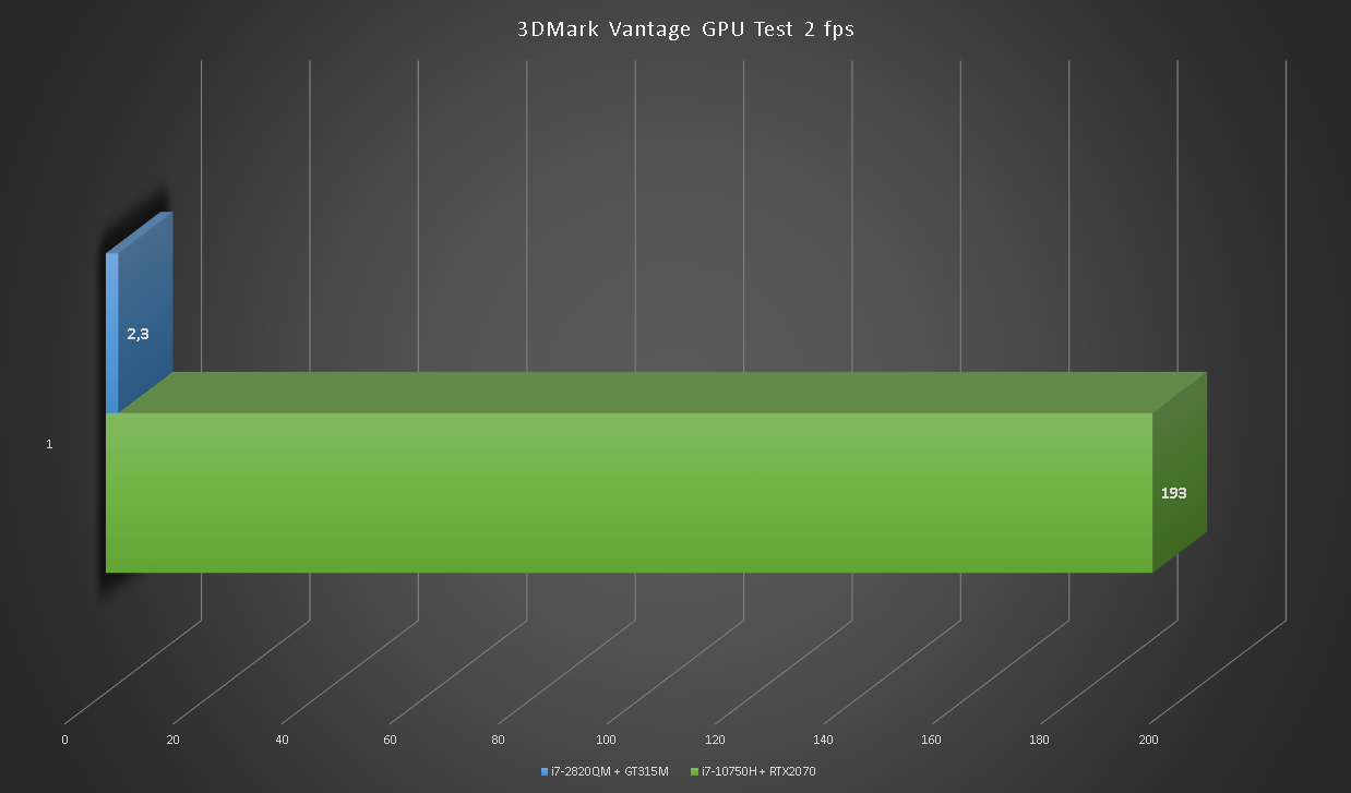 Глядя на такой одиннадцатикратный разрыв сложно поверить в то, что на GT315M можно играть. Больше тысячи кадров в секунду в игровых тестах RTX2070 впечатляют.