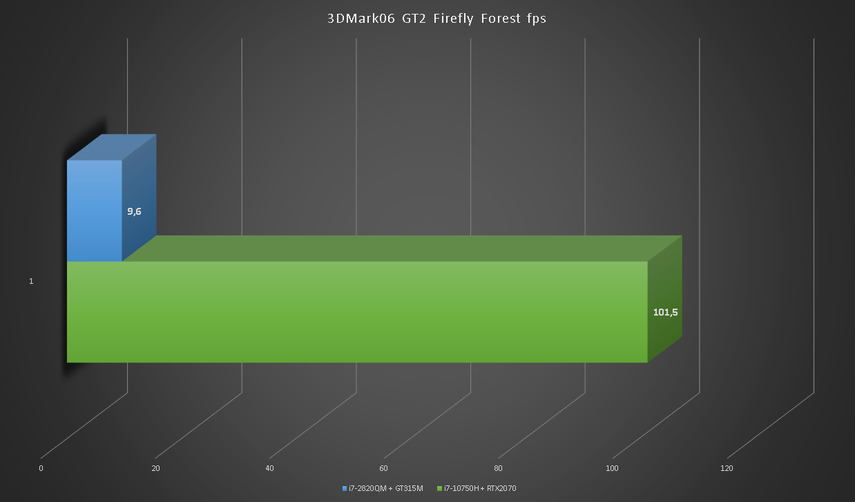 Бенчмарк 3DMark06 оказался тяжелым испытанием для GT315M. Превосходство RTX2070 более чем одиннадцать раз.