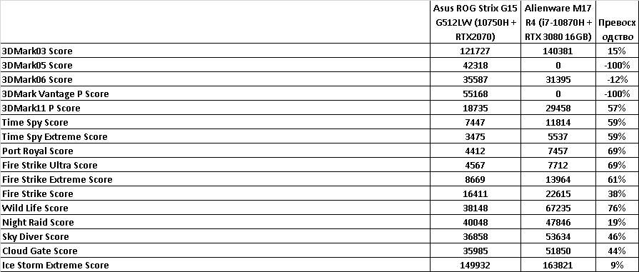 Теперь, после обзора моего ноутбука Alienware M17 R4 (i7-10870H + RTX 3080 16GB) настало время тестов. Сравнивать я буду со своим старым ноутбуком ASUS ROG Strix G G512LW (i7-10750H + RTX 2070 8GB). Таким образом обладатели видеокарты RTX 2070 или схожей по производительности (схожие по производительности это RTX 2070 Super Laptop, RTX 2080 Max-Q Laptop, Quadro RTX 4000 Laptop, RTX A3000 Laptop, RTX 3060 Laptop) смогут оценить, что им даст переход на RTX 3080 Laptop.
