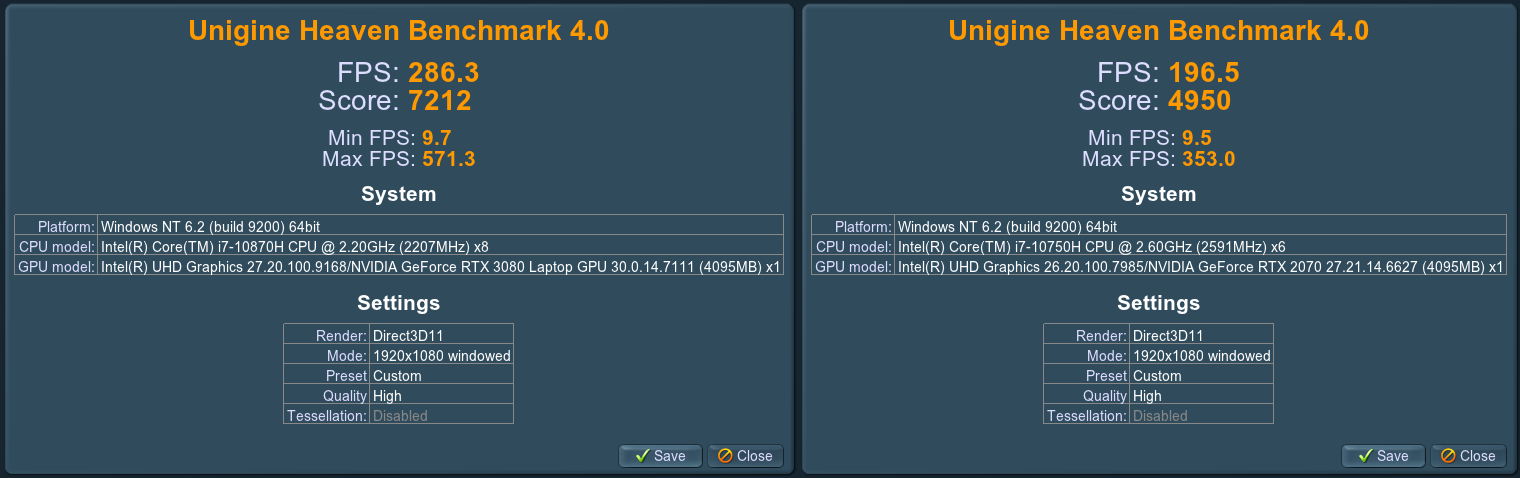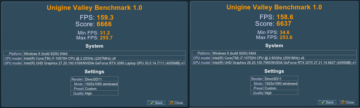 Главное в тестах — это то, что одинаковые тестовые утилиты показывают величину прироста производительности. Этот процент можно использовать, чтобы теоретически оценить прирост в других приложениях. Забегая вперед, скажу – в среднем по сумме всех тестов RTX 3080 Laptop 165W быстрее чем RTX 2070 Laptop 115W на 50%. Это именно в среднем по больнице, есть тесты, где прирост нулевой, а есть где прирост 100%.