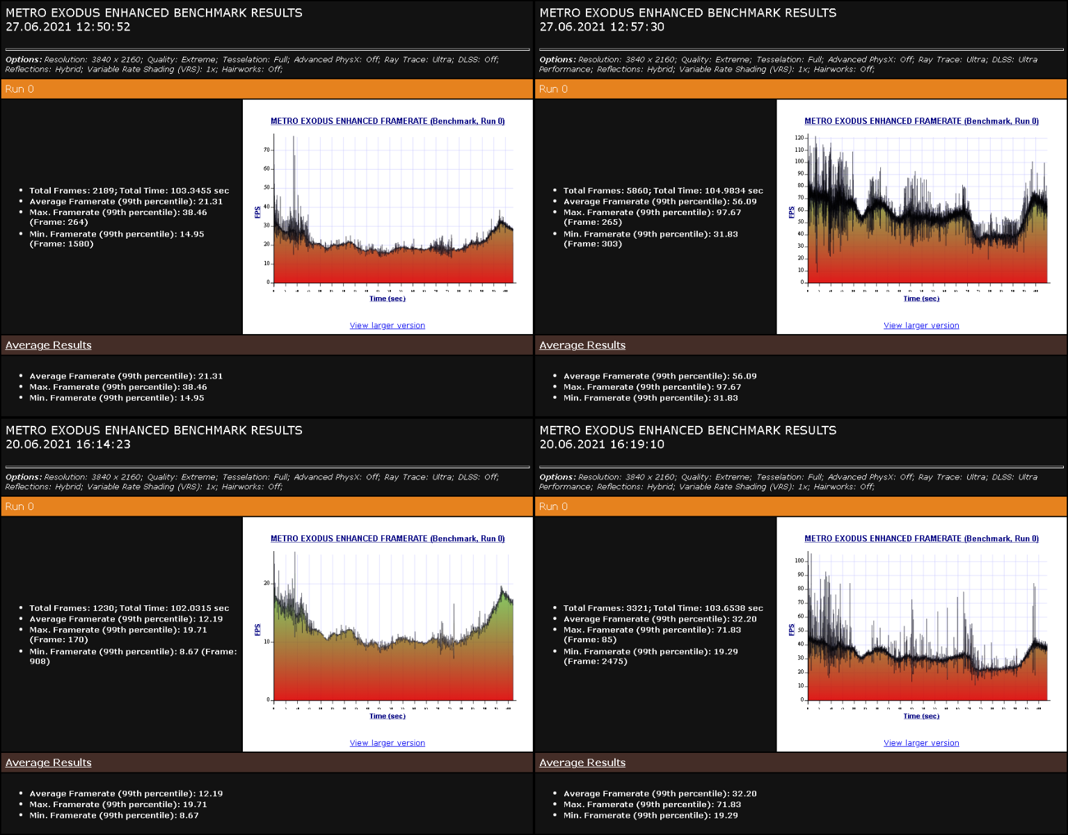 В Metro Exodus Enhanced результаты в 4К как с включенным DLSS, так и с выключенным DLSS показывают преимущество в 75%. По максимальному кадру с выключенным DLSS преимущество составляет 100%. Но все равно у 3080 это 38 кадров, что трудно назвать играбельным. Так что поиграть в 4K в Metro Exodus Enhanced с выключенным DLSS комфортно не получится. А вот если включить DLSS, то средний кадр превращается в 56, что вполне играбельно.