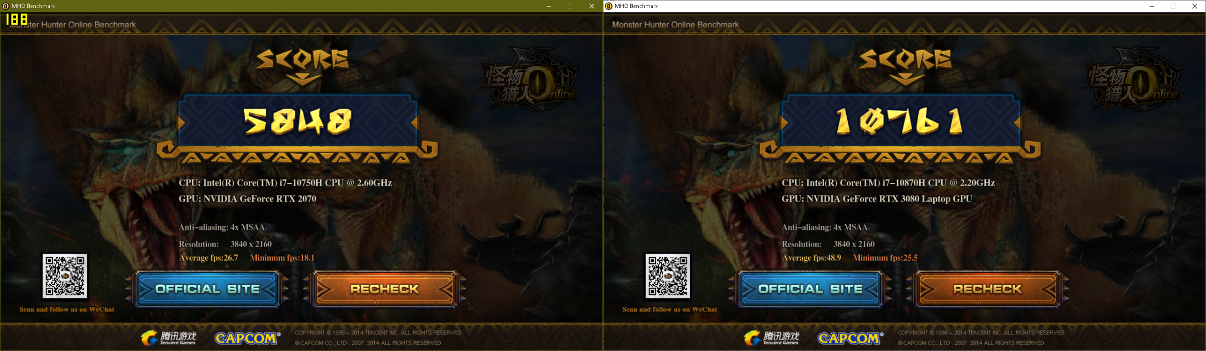 В тесте Monster Hunter Online Benchmark по среднему кадру 3080 на 85% быстрее, чем 2070.