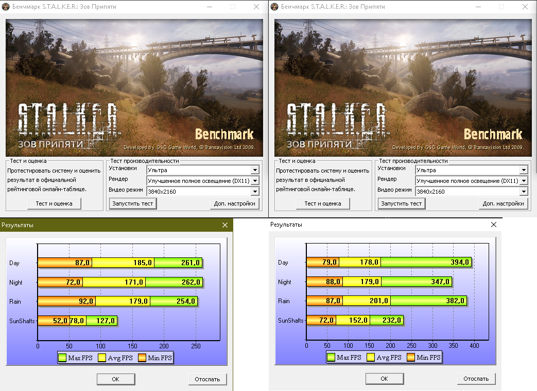 И последний тест – популярная игра S.T.A.L.K.E.R. Зов Припяти. На разных картах новинка в лице RTX 3080 ведет себя по-разному. На карте Day по среднему кадру 3080 оказалась на 4% хуже. На карте Night на 5% лучше, на карте Rain – 12%, а на карте SunShafts уже приличные 95%. Если смотреть на максимальные кадры, то преимущество составляет по четырем сценам соответственно 51-32-50-83 %. Как бы там ни было, в эту игру комфортно играть на любой карте.