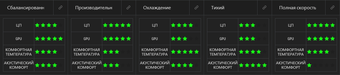 В AWCC есть подсказка о том, что дают и меняют профили питания и охлаждения. По четырем критериям расставлен рейтинг из звезд. В одном случае будет хорошо процессору и видеокарте, но плохо будет пользователю из-за низкого акустического комфорта. Если просто сложить число звезд, то распределение звезд будет таким: 17-16-16-15-15. Так что больше всего звезд получает Сбалансированный режим.