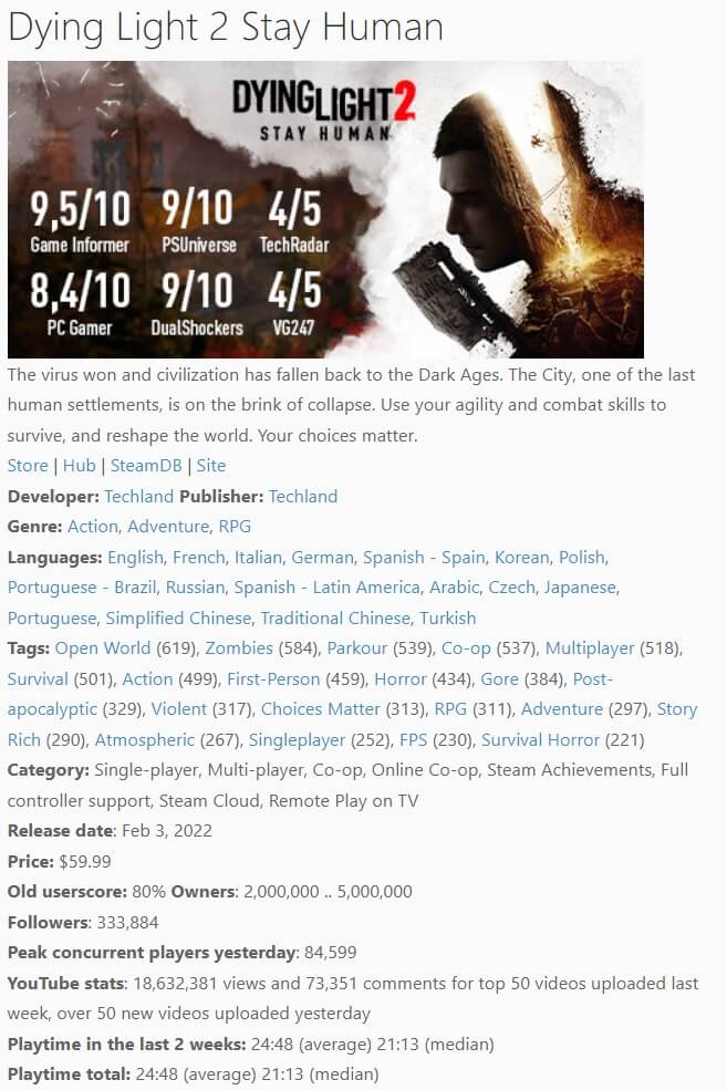 Несколько дней назад поступала информация о том, что Dying Light 2 превысила миллион продаж на ПК. И вот, согласно последним данным SteamSpy, последний зомби FPS от Techland уже превысил два миллиона копий на Steam.