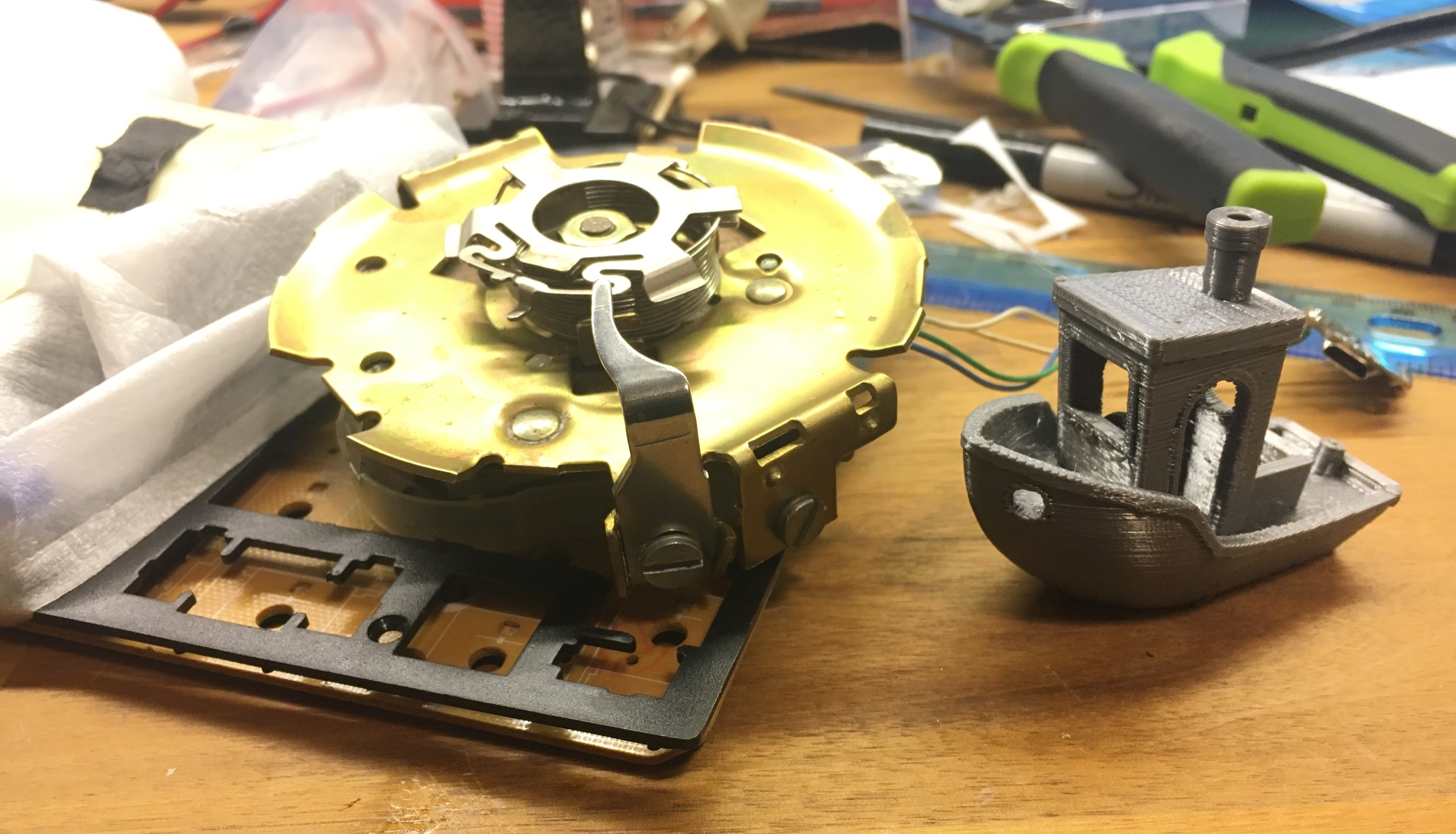 После того как клавиатура была обработана пилой, осциллирующей фрезой и инструментом Dremel, он смог подсоединить циферблат к остаткам печатной платы клавиатуры.